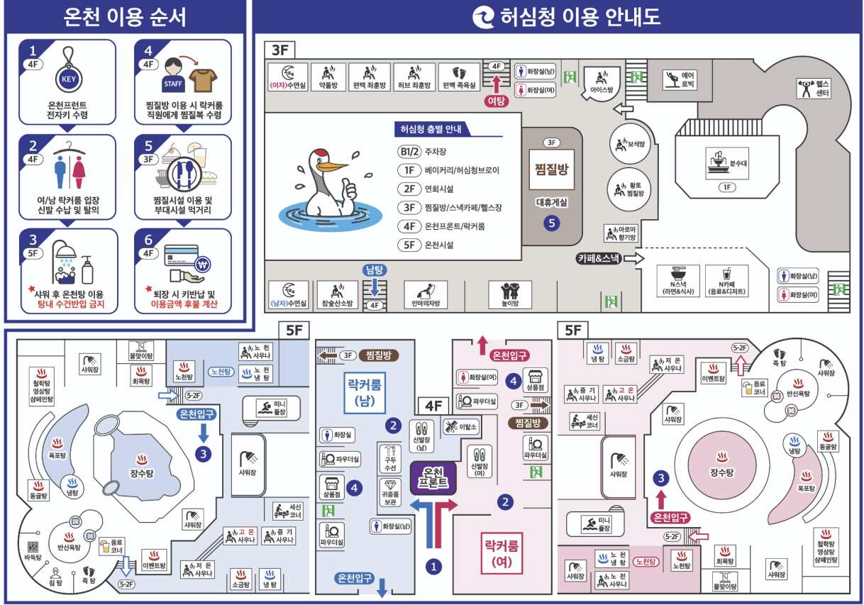 - ※ 요금 및 운영 시간은 변경될 수 있으므로 방문 전에 공식 허심청 홈페이지 나 전화로 확인하시기 바랍니다