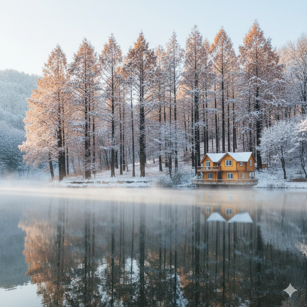 겨울철 논산 온빛자연휴양림의 호수 수면에 비치는 설경은 그야말로 '인생 사진'을 남기기에 충분한 포토스팟입니다.