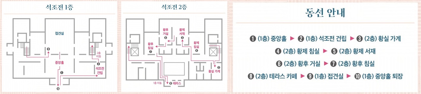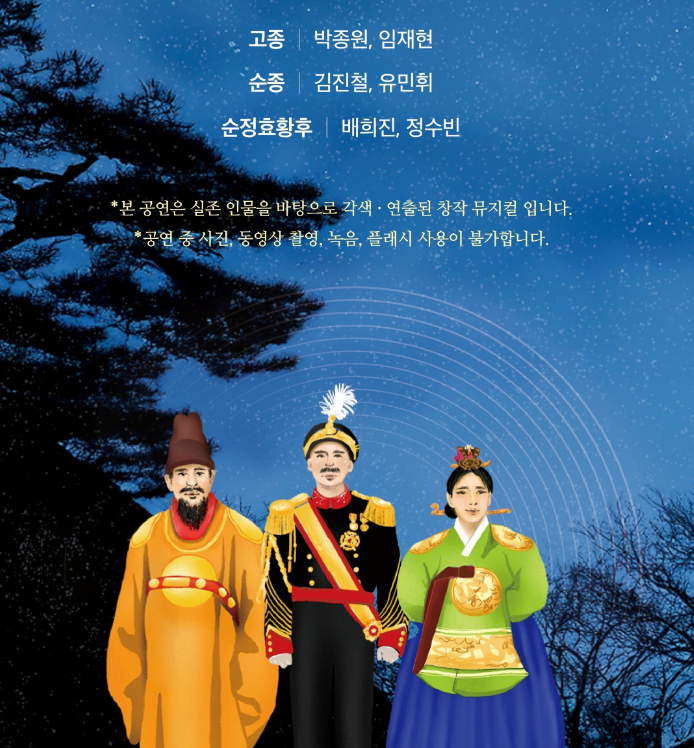 모든 여정을 마친 후엔 석조전 접견실에서 특별한 창작 뮤지컬이 기다리고 있어요. 근대 황실의 배경 속 상상과 역사적 이야기를 엮은 공연은 전통과 예술이 어우러진 색다른 매력을 보여줍니다. 이 공연은 단순한 뮤지컬이 아닌, 석조전이라는 공간과 감각적으로 어우러지는 독특한 무대로 많은 분들이 감탄하는 포인트예요.