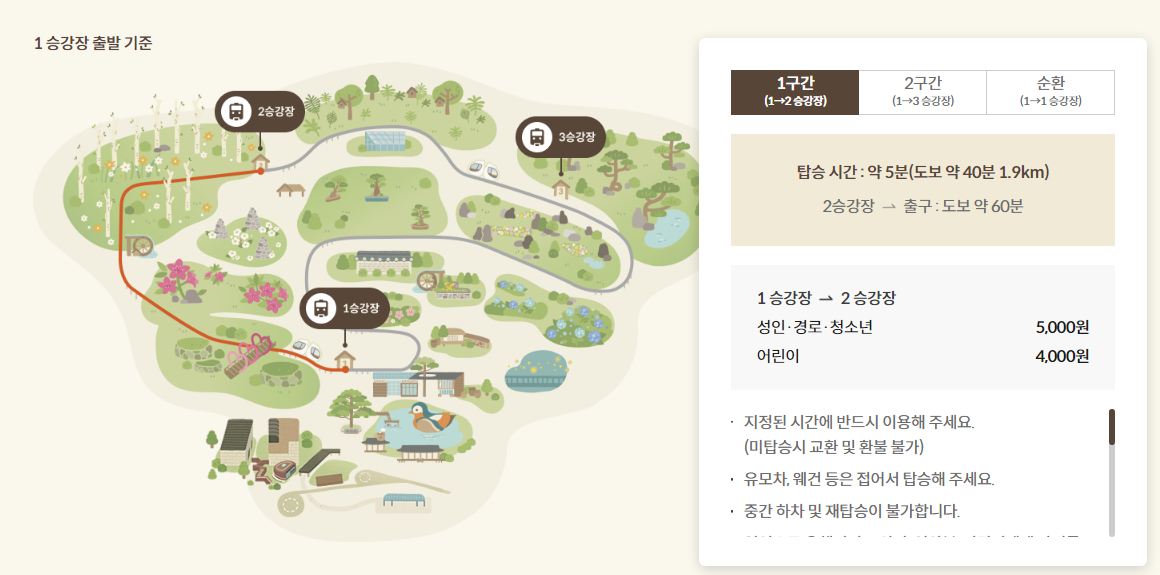 입장 → 모노레일(1승강장~2승강장) → 단풍정원 → 자작나무숲 → 이끼원 → 산책길 하산