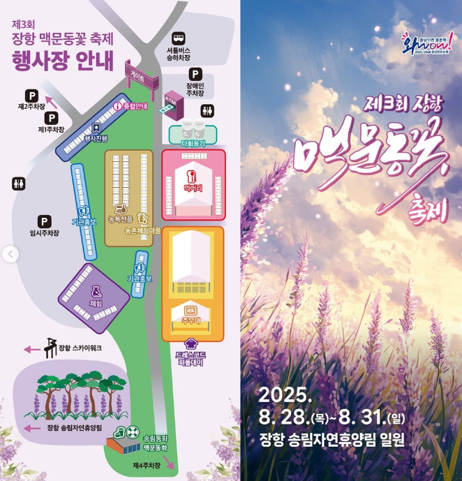 2025년 8월 28일부터 31일까지는 이곳에서 ‘제3회 장항 맥문동 꽃 축제’가 열립니다. 여름의 끝자락, 은은한 꽃내음과 시원한 바닷바람을 동시에 즐길 수 있는 이 축제는 감성 충만한 여행을 원하시는 분께 딱이에요.