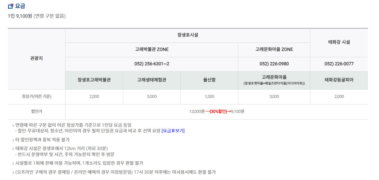 - 혜택 내용: 고래박물관, 생태체험관, 울산함, 고래문화마을, 태화강 동굴피아 등 5개 유료 관광지를 30% 할인된 가격으로 이용 가능합니다.