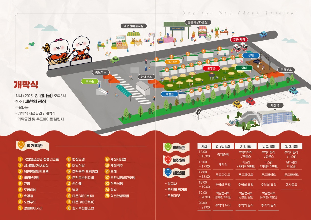 제천시는 2021년 ‘제천빨간오뎅’이라는 명칭을 특허청에 상표등록하며, 지역의 고유 브랜드로 공식화하였고 이번 축제를 통해지역 명물을 보호하고 홍보할 예정입니다. 특히 레트로 감성의 포장마차 거리가 조성되며, 빨간오뎅을 비롯한 다양한 먹거리를 맛볼 수 있습니다. 또한, 푸드파이트 챌린지, 공연, 가족 체험 프로그램 등 남녀노소 모두가 즐길 수 있는 다양한 이벤트가 펼쳐질 예정입니다.