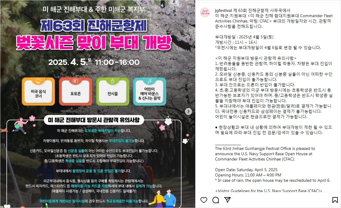 📅 신청: 3월 10일 ~ 3월 24일 (진해군항제 홈페이지)